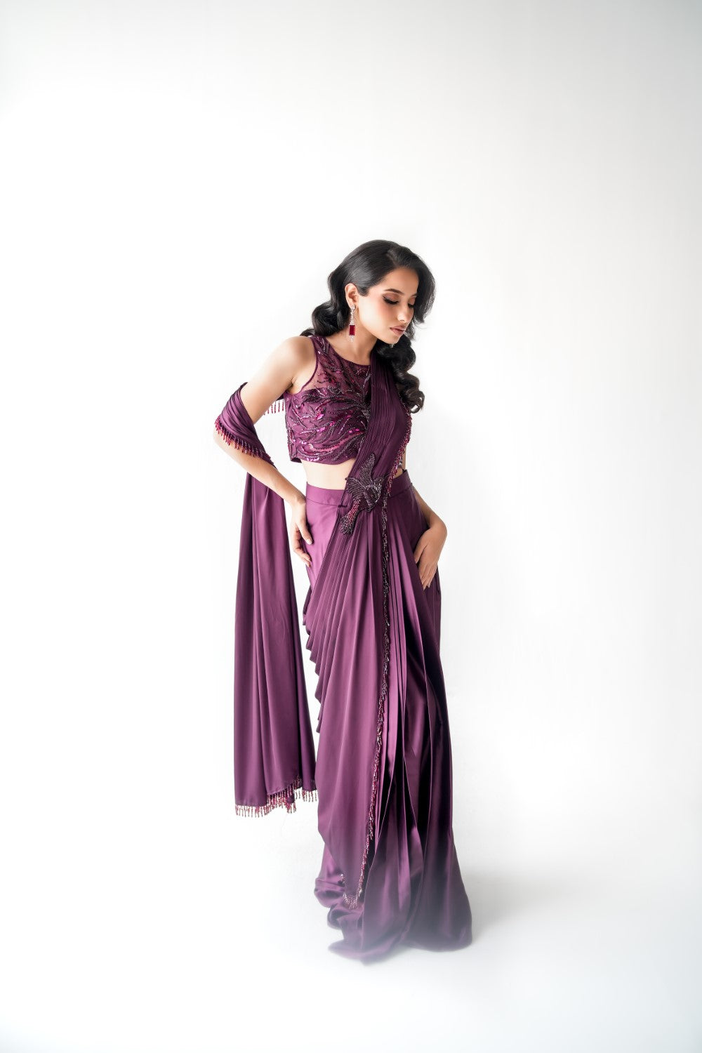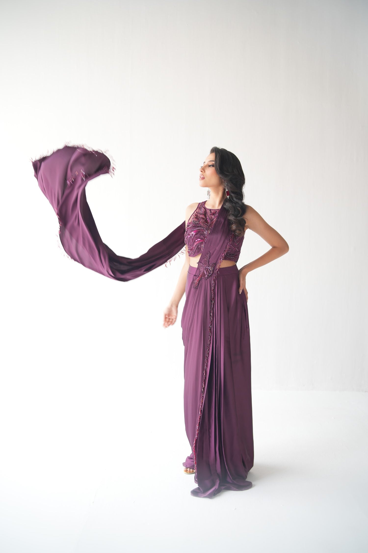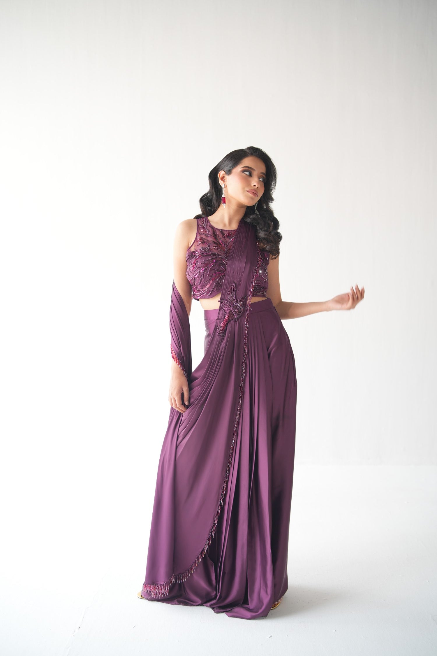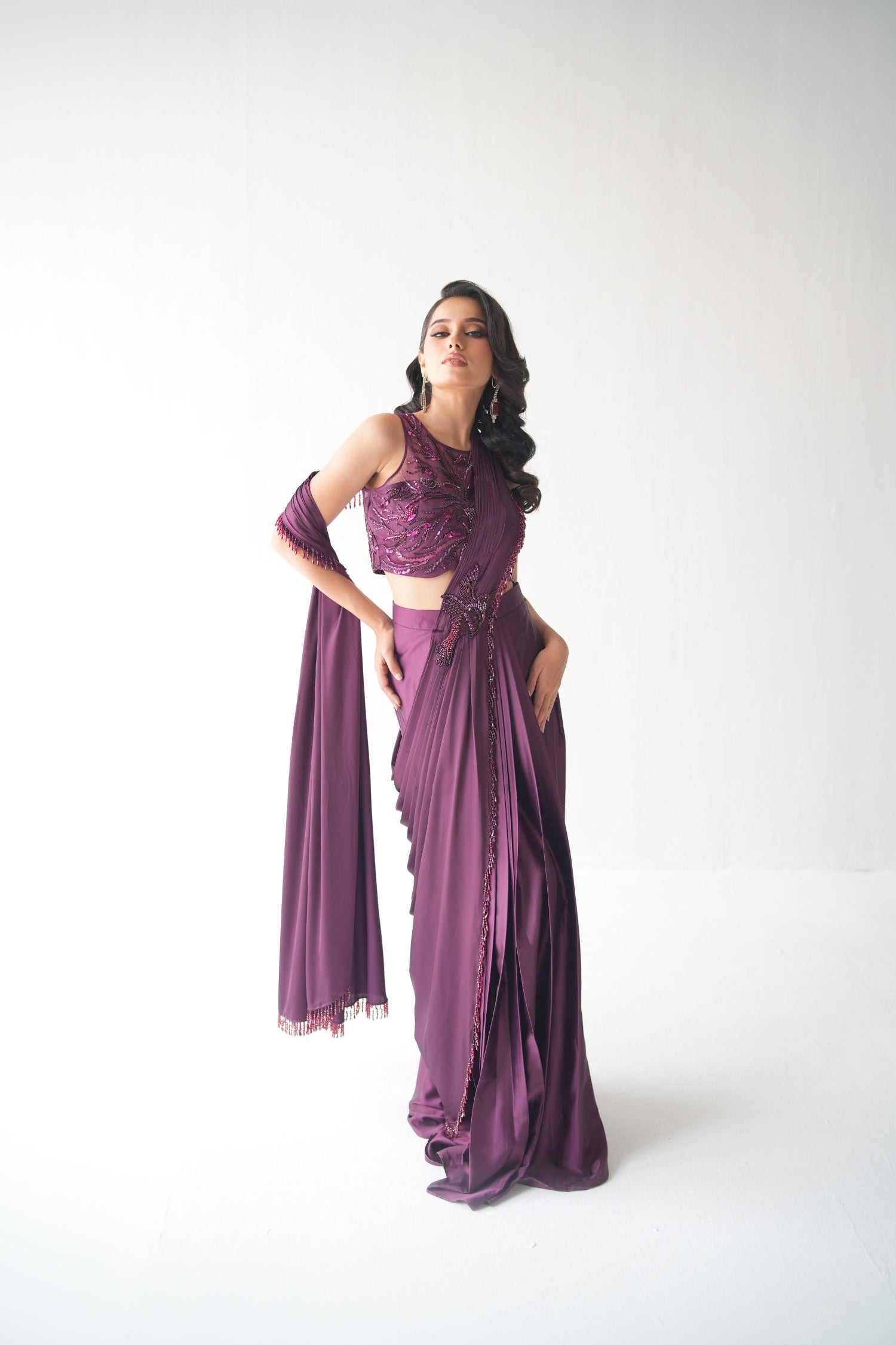 Rich plum hue with an intricately embroidered sleeveless blouse featuring pre-draped saree perfect for weddings, receptions oe evening galas.