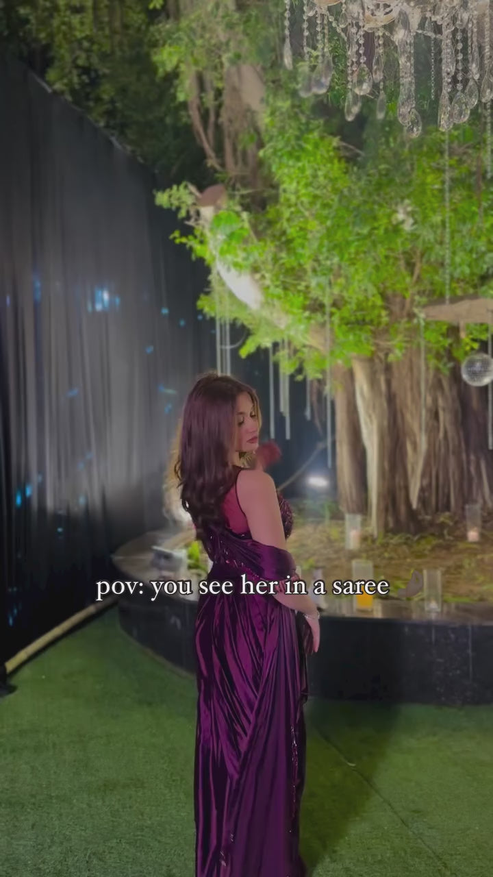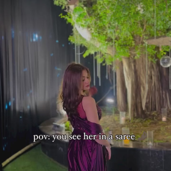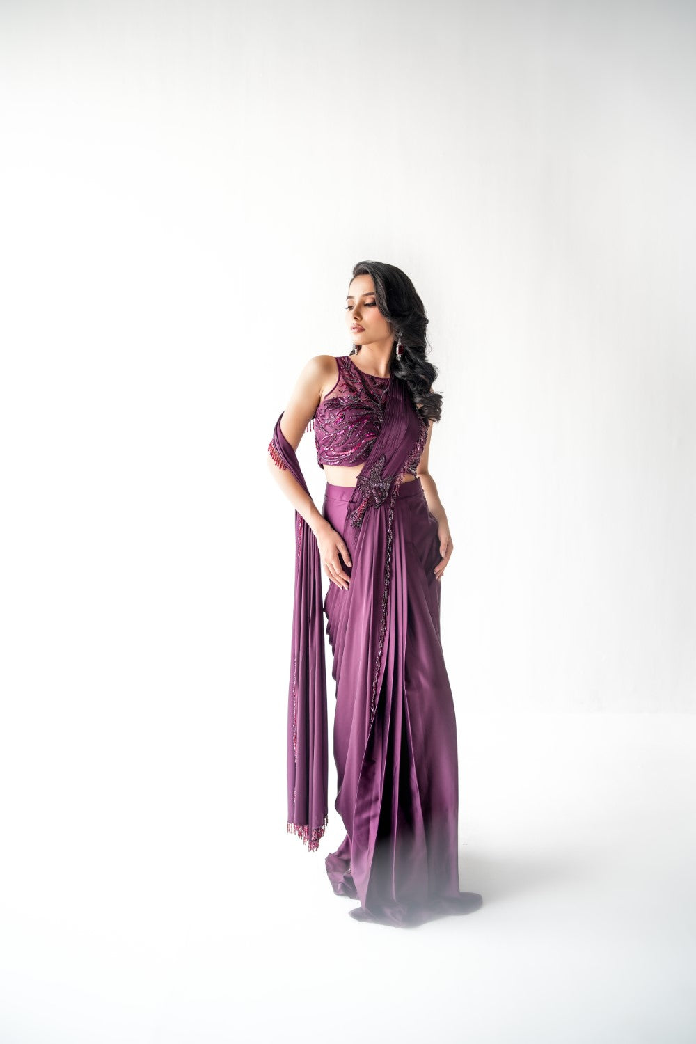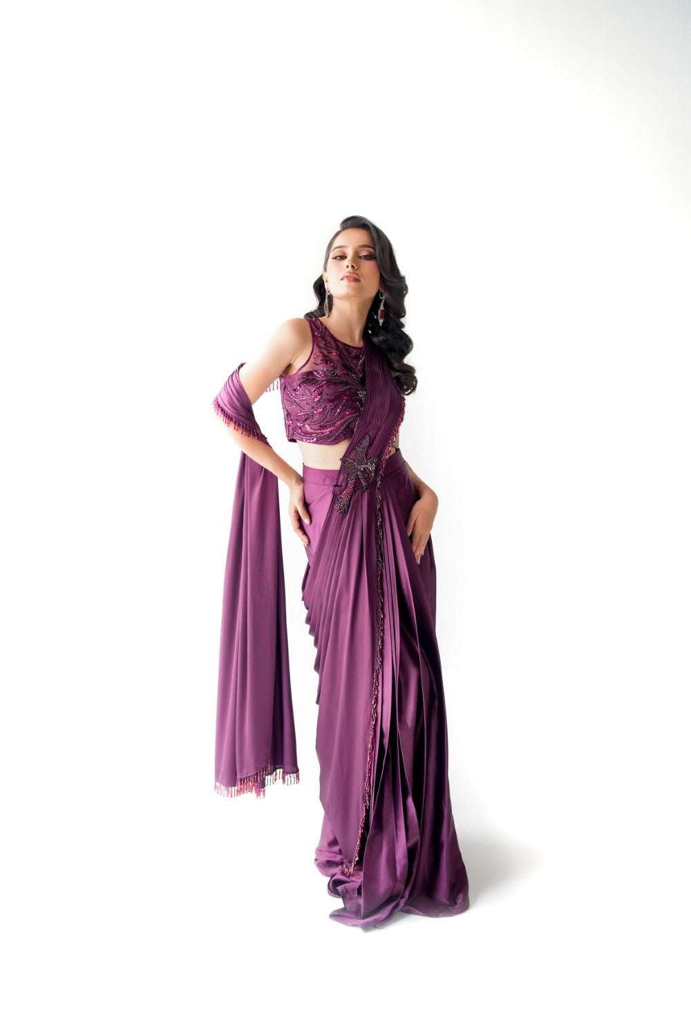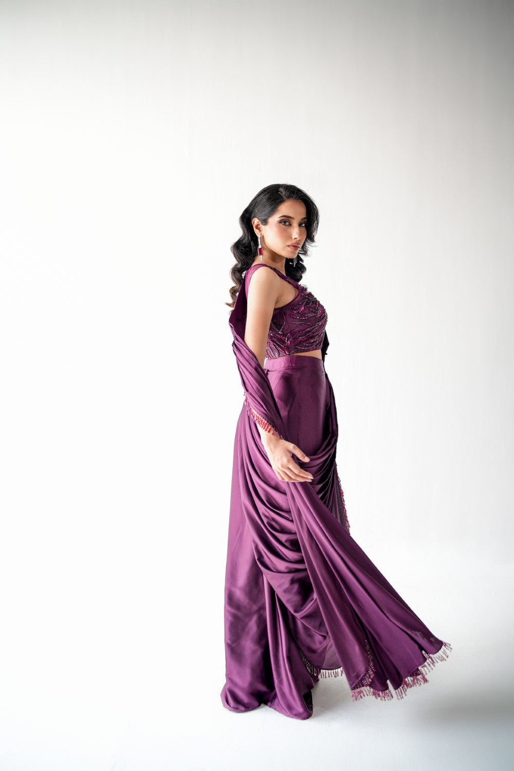 Rich plum hue with an intricately embroidered sleeveless blouse featuring pre-draped saree perfect for weddings, receptions oe evening galas.