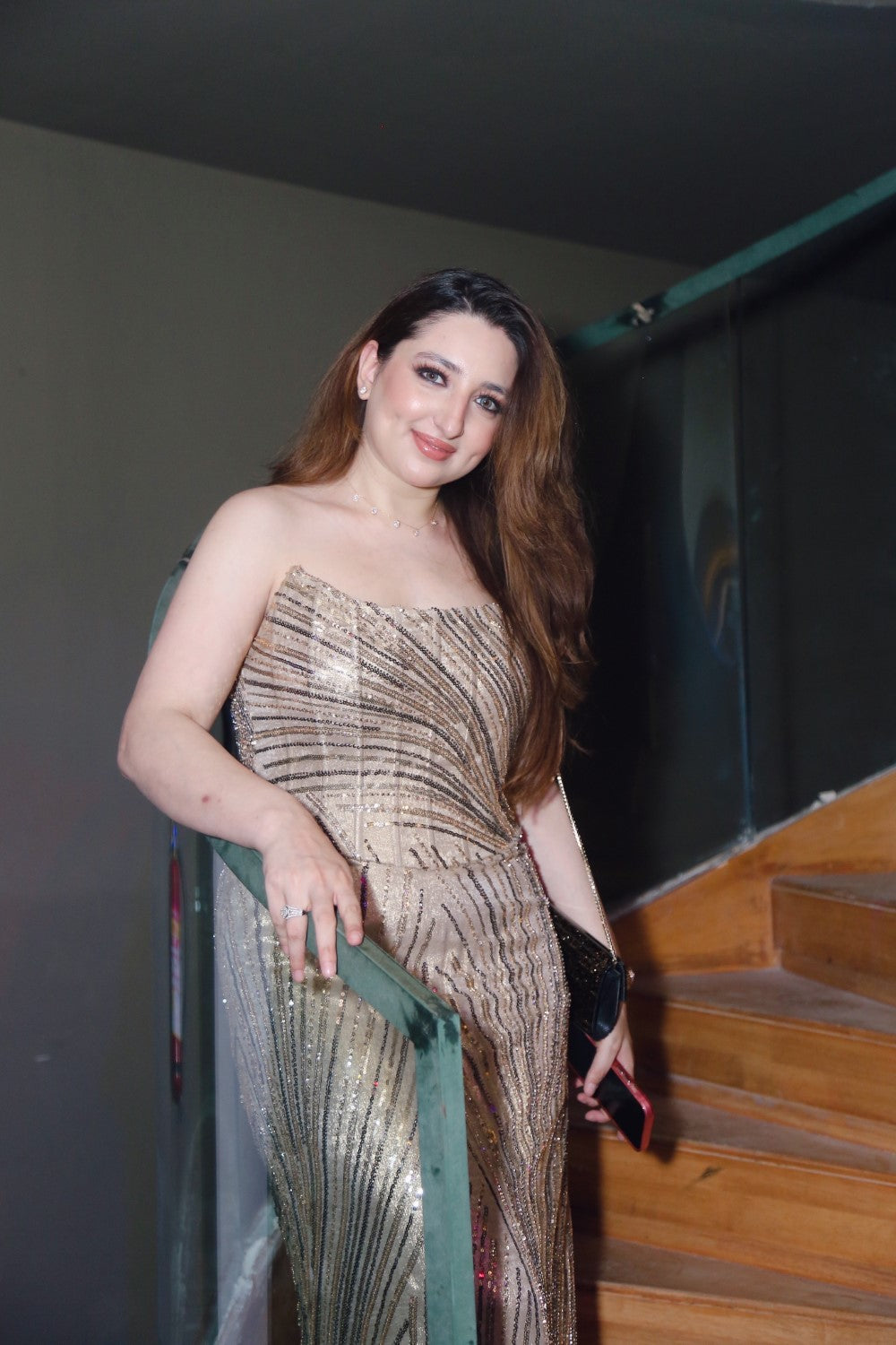 Stunning gold sequin strapless corset gown with an elegant body hugging silhouette and wave-like embellishments that reflect light beautifully. Perfect for a red carpet, cocktail party, or upscale evening event.