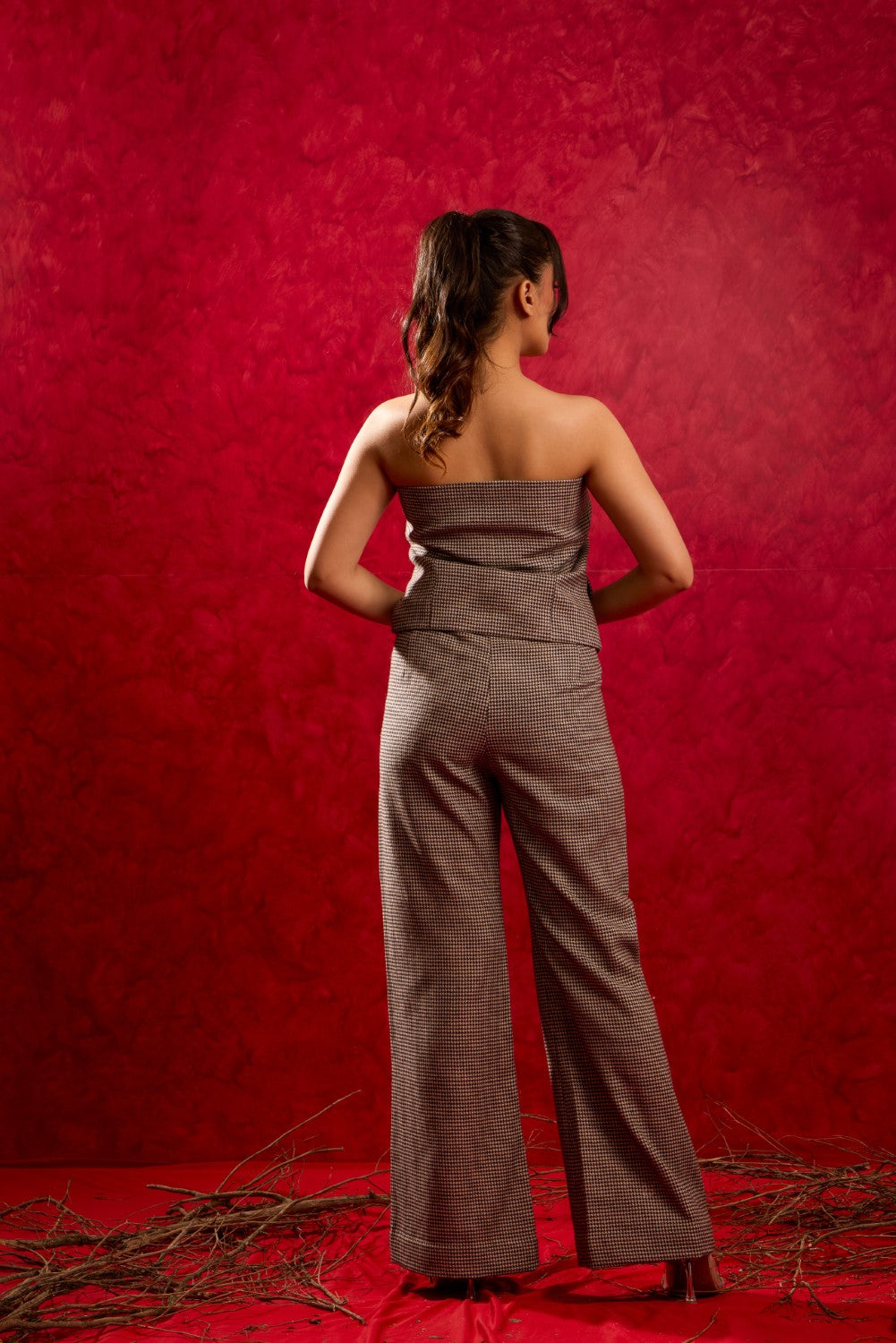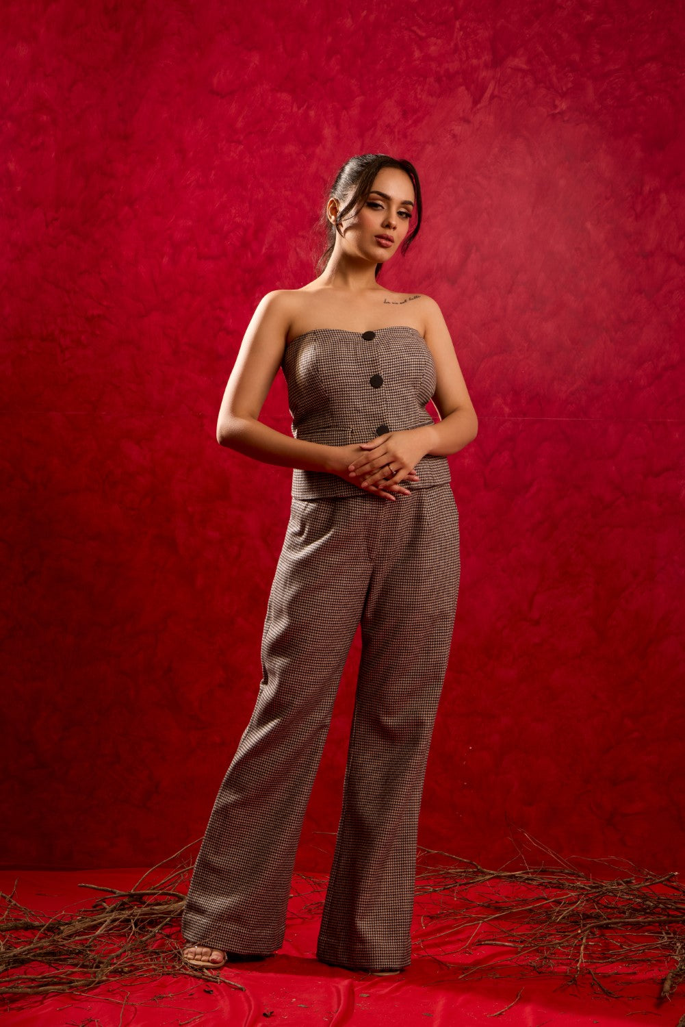 A tailored brown Houndstooth double-breasted blazer paired with matching trousers and off shoulder waist-coat. The structured shoulders and clean lines emphasise power dressing.