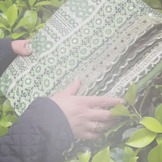 Beautiful digital printed green saree featuring intricate mirror work, sequin detailing. This handcrafted saree showcases traditional artistry through geometric motifs in a rich palette of emerald green and silver.