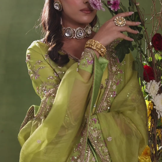 Featuring classic hand embroidered kurta with Gharara pants and a heavy organza dupatta. Delicate embroidery comes together with lavender-pink accents.