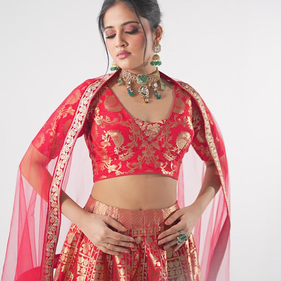Luxurious red banarasi lehenga set with intricate Gold Zari floral and geometric motifs. A structured red blouse with voluminous flared lehenga is paired with a net dupatta with embroidered border.