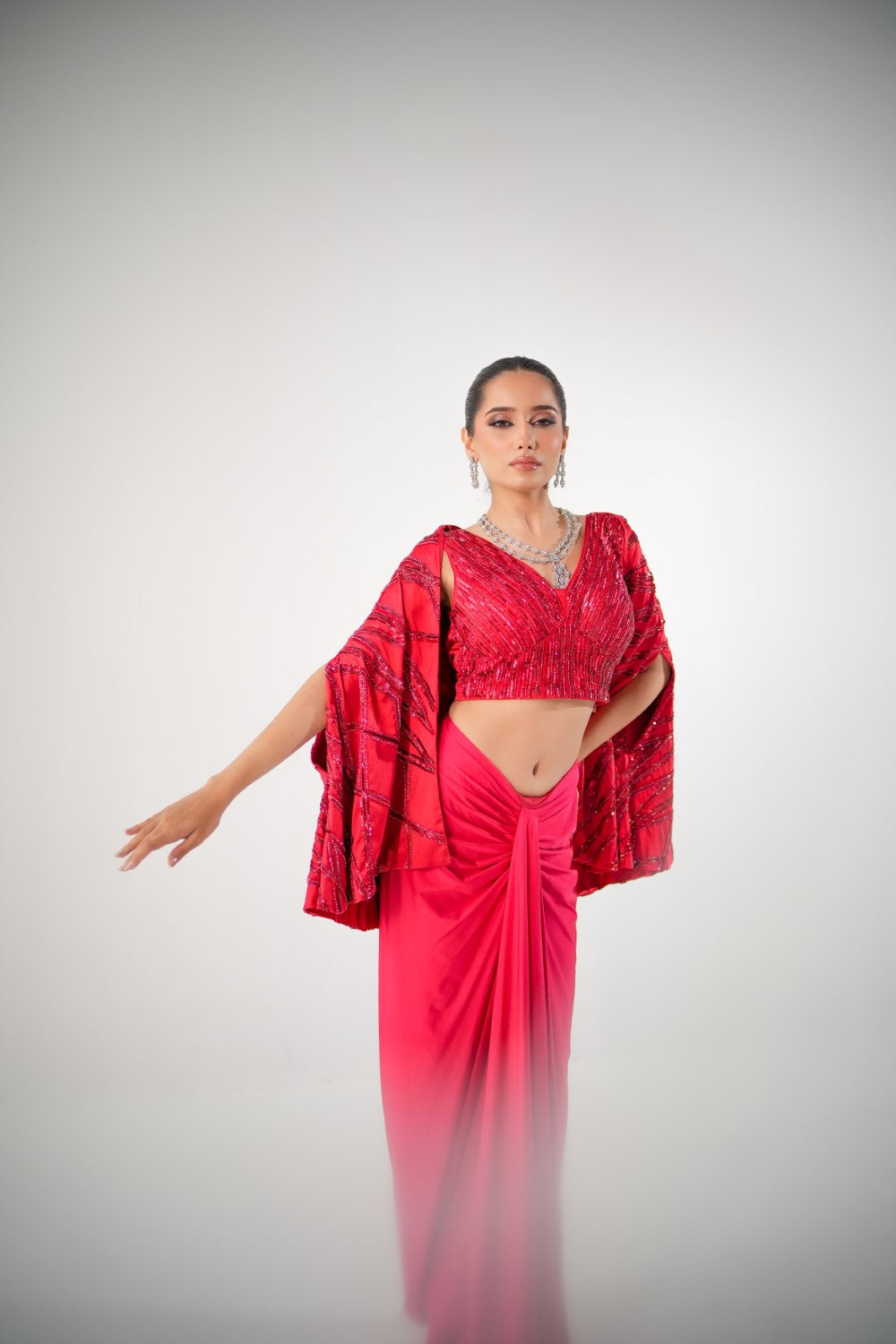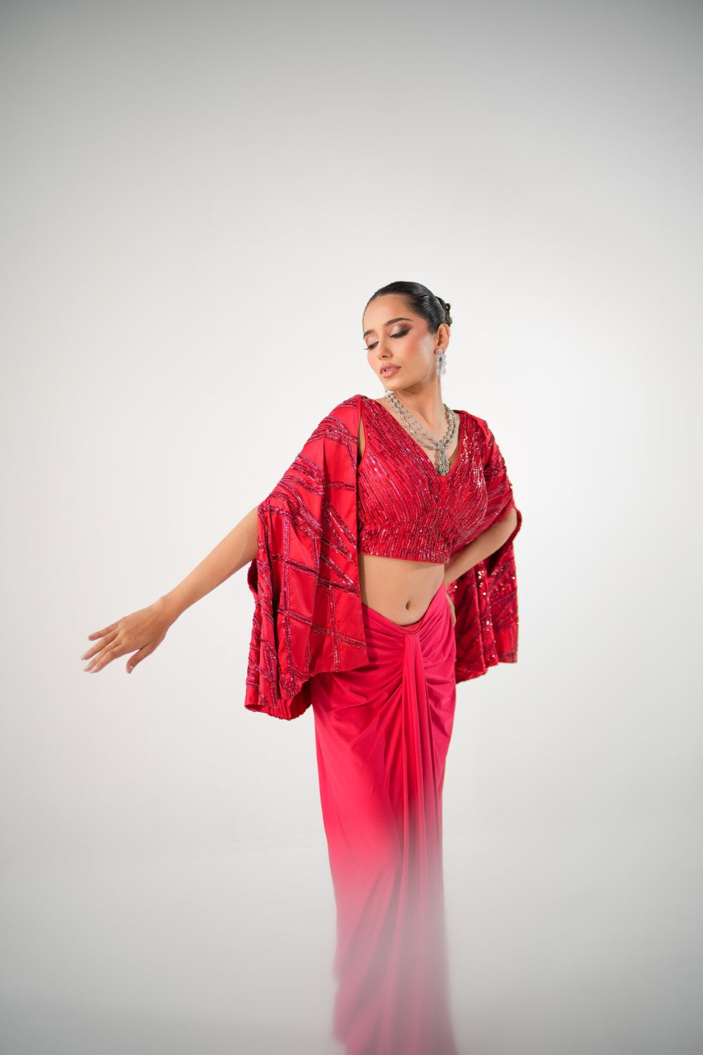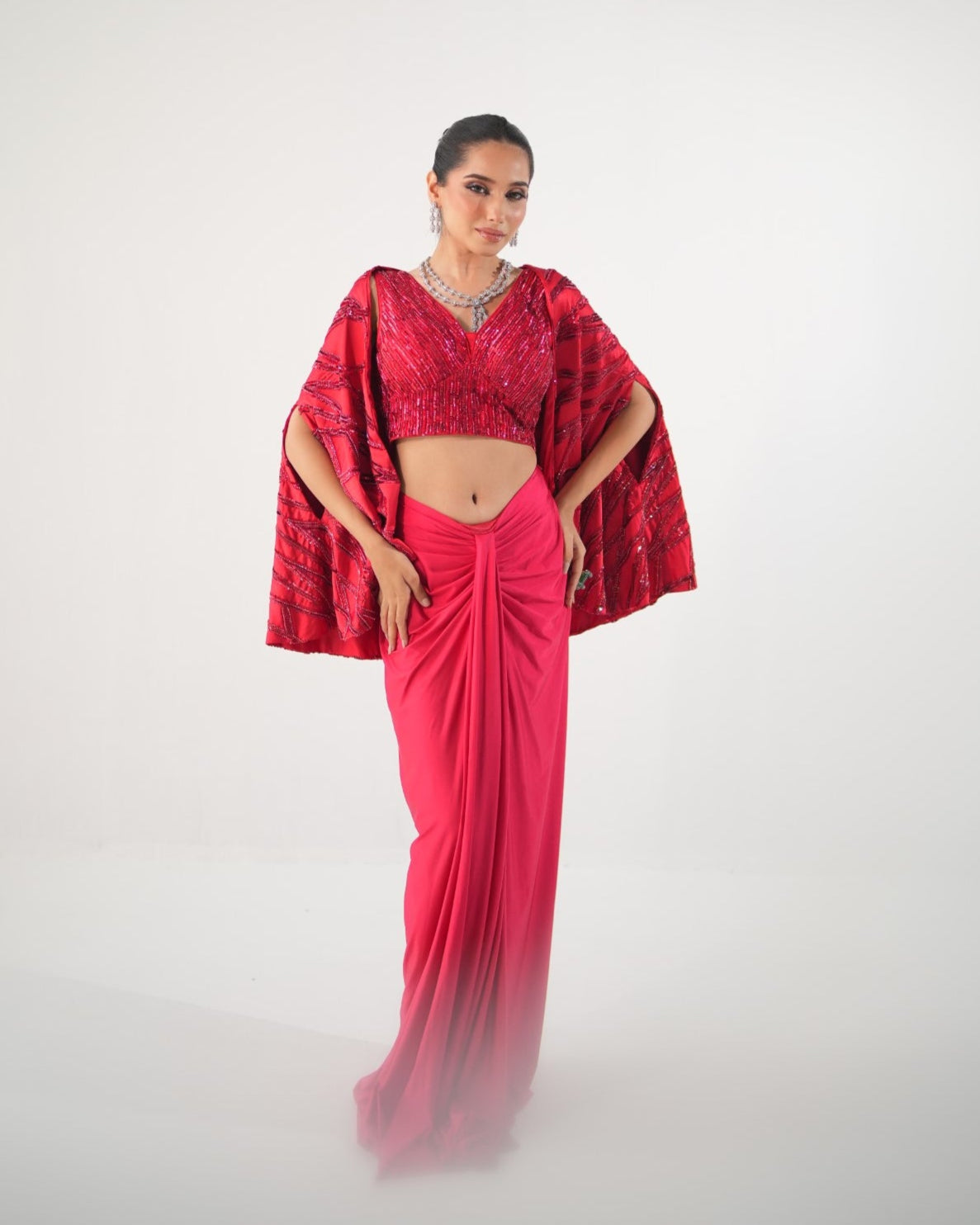Red Lycra Skirt featuring sequin blouse paired with a fully embellished cape.