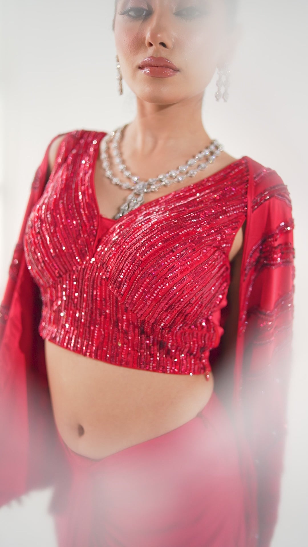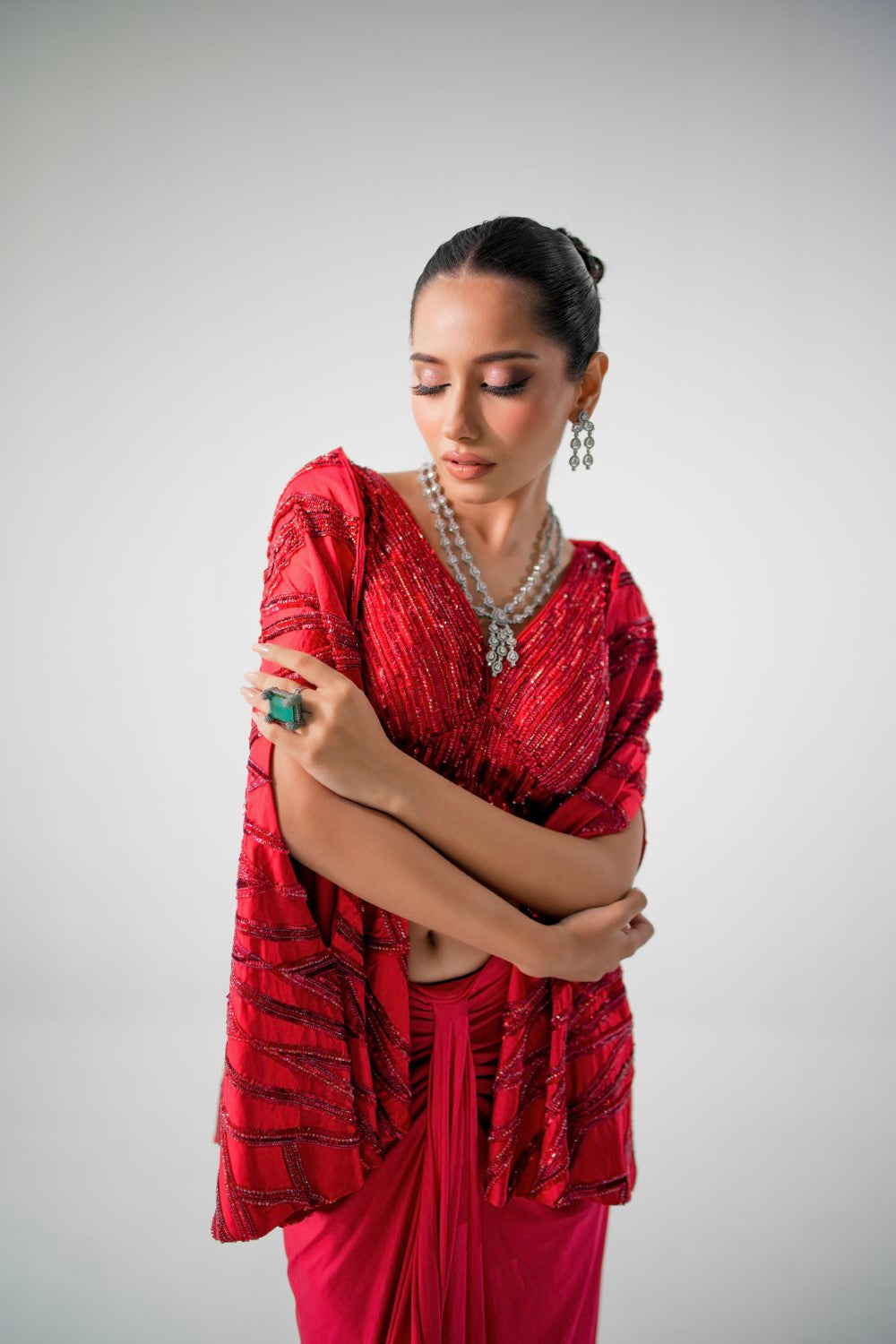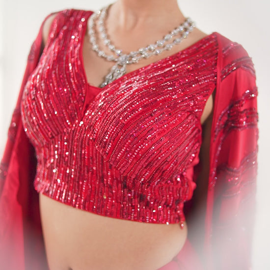 Red Lycra Skirt featuring sequin blouse paired with a fully embellished cape.