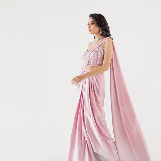 Satin pre-draped saree featuring embroidered blouse with beads and crystal work.