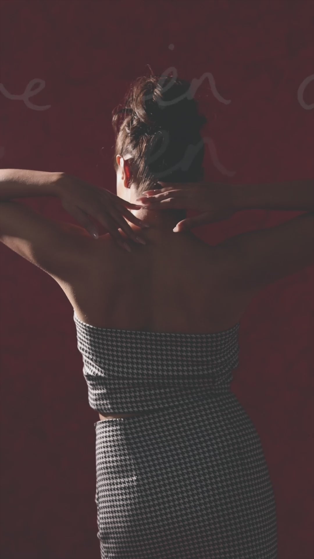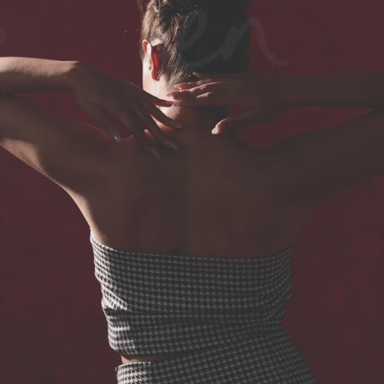 Featuring black and white houndstooth two-piece set - a sleeveless cropt top with buttons and a matching high-waisted pencil skirt.